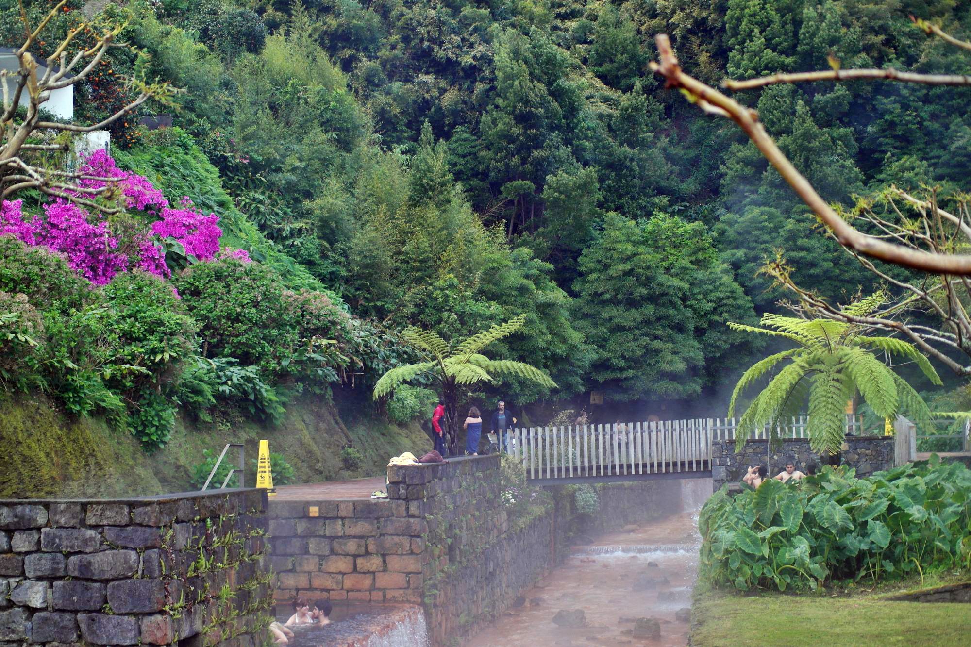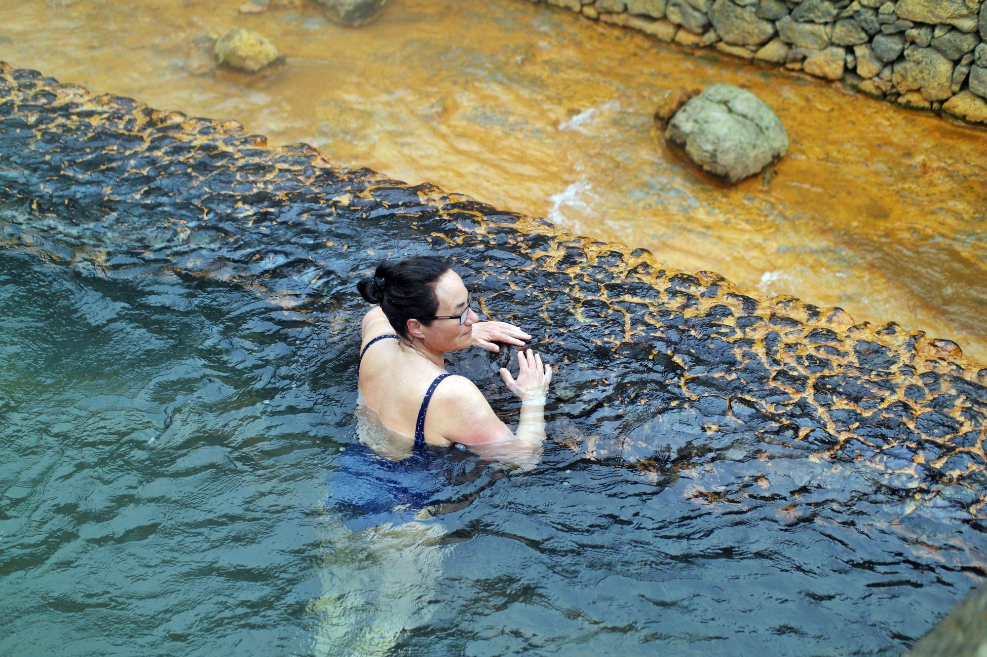 Wir baden in den „Poca da Dona Peija“. Dort sprudelt aus einer FeAlsgrotte ca. 40 Grad heißes eisen- und schwefelhältiges Wasser, das in mehrere Badepools umgeleitet wird.
